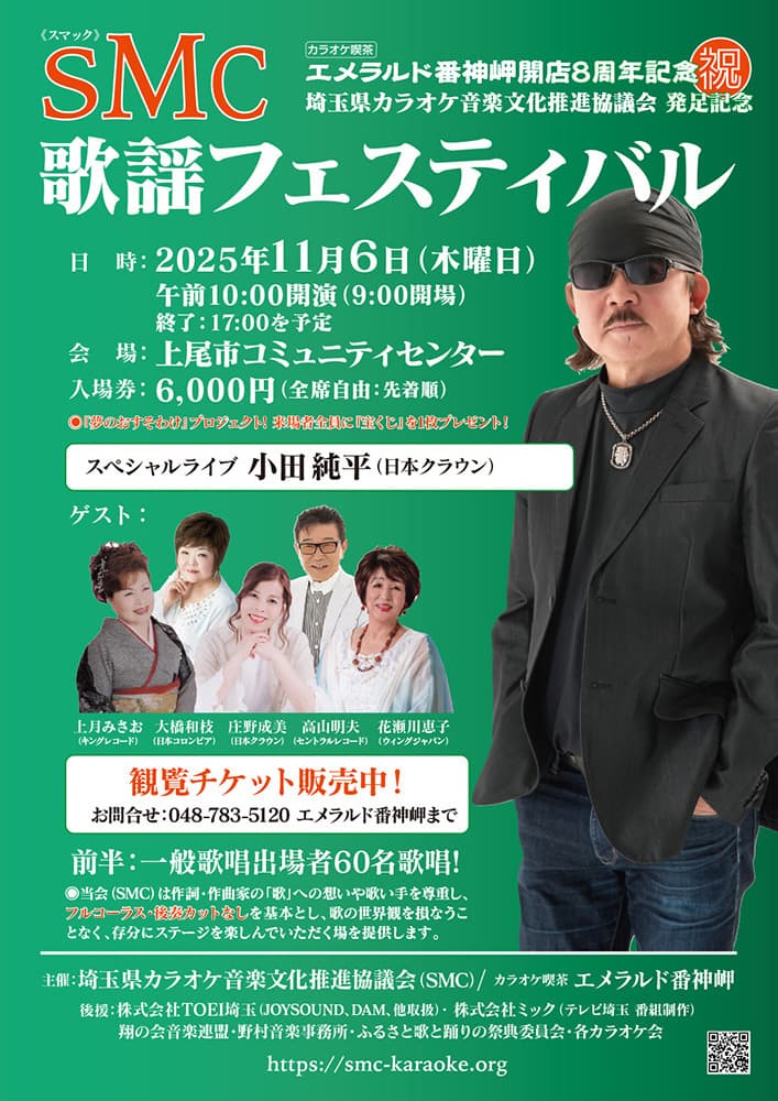 お客様にお店の正しい情報を発信!カラオケ音楽文化の発展・育成に貢献!! カラオケカフェ リスト ※画像クリックで ⇒ 詳細ページへGO! いち早く会の主旨にご賛同いただいた会員様のカラカフェです。 カラオケカフェ エメラルド番神岬 上尾市藤浪 ファミリーカラオケ ムーンストーン 日高市下鹿山 Live & Song Crystal 草加市栄町 カラオケステージ VANVAN 岩槻区日出町 カラオケ ライブ ステージ パキラの響 上尾市原市 カラオケカフェ ヴォーカランド さいたま市桜区 カラオケ ラマン ふじみ野市上福岡 カラオケ サンロード 北葛飾郡杉戸町深輪 会員募集 !! お店情報を掲載しませんか!?これからはさらに正確で取得しやすい情報発信が営業の要!!会員になれば、年間24.000円でWEB ページが持てます!! ご希望の方は上の「会員募集!!」をクリック! お知らせ おかげさまで無事開催いたしました!SMC発足記念歌謡フェスティバル 2025年11月6日SMC歌謡フェスティバル 日 時:2025年11月6日木曜日 午前10:00開演(9:00開場)場 所:上尾市コミュニティセンター (上尾市柏座4-2-3)入場券:6,000円(全席自由)主 催: 埼玉県カラオケ音楽文化推進協議会 カラオケ喫茶 エメラルド番神岬 入場チケット購入 及び 一般歌唱参加は、下記のどちらかの方法で申込できます① 上記ポスター掲示のカラオケ店にて購入② 下記、当サイト予約フォームから③ 電話で予約、048-783-5120 (エメラルド番神岬)
